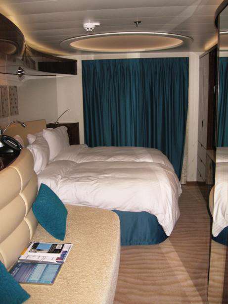 The balcony, inside and studio staterooms were all beautifully appointed with glass art panels, attractive curtains and throw pillows, duvets and colorful coverlets on the beds. We found the new divided bathroom concept convenient for two people getting ready at the same time in the morning. It’s also nice to have the sliding glass door for the shower instead of a shower curtain sticking to you.
