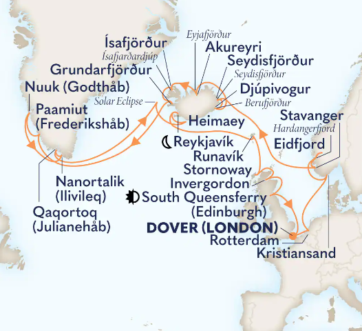 Join us as we search the skies on Holland America Line’s 28-Day Scandinavia Solar Eclipse With Greenland & Scotland cruise on board Nieuw Statendam. This roundtrip departs Dover and includes an overnight in Edinburgh (South Queensferry) and a late night departure from Reykjavik. Enjoy scenic cruising through spectacular fjords in Norway and Iceland, visiting remote communities in Greenland, as well as an amazing opportunity to experience the solar eclipse in western Iceland. Take advantage of Cruise Specialists hosted program, featuring our own host, Tom Mullen, along with exclusive amenities for our privileged guests.