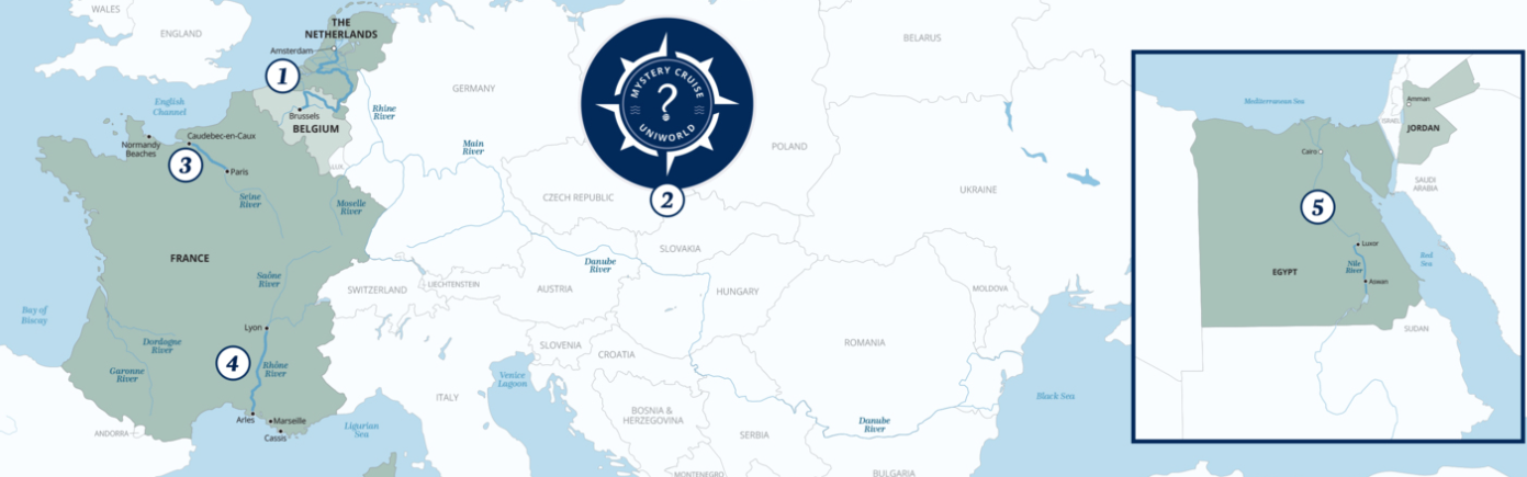 Celebrate Uniworld's 50th anniversary with this 50-Night Rivers of the World cruise in 2026. Explore 6 rivers and their tributaries seamlessly via 5 river cruise ships as you cruise the Rhine, Seine, Rhône, Saône, and Nile rivers from Belgium and the Netherlands to France to a Mystery Cruise and conclude in Jordan. Enjoy exclusive experiences and Uniworld's popular Mystery Cruise during this thrilling adventure. Immerse in each destination and enjoy impeccable service. Uniworld's all-inclusive luxury and attention to detail combine to create an unforgettable voyage.