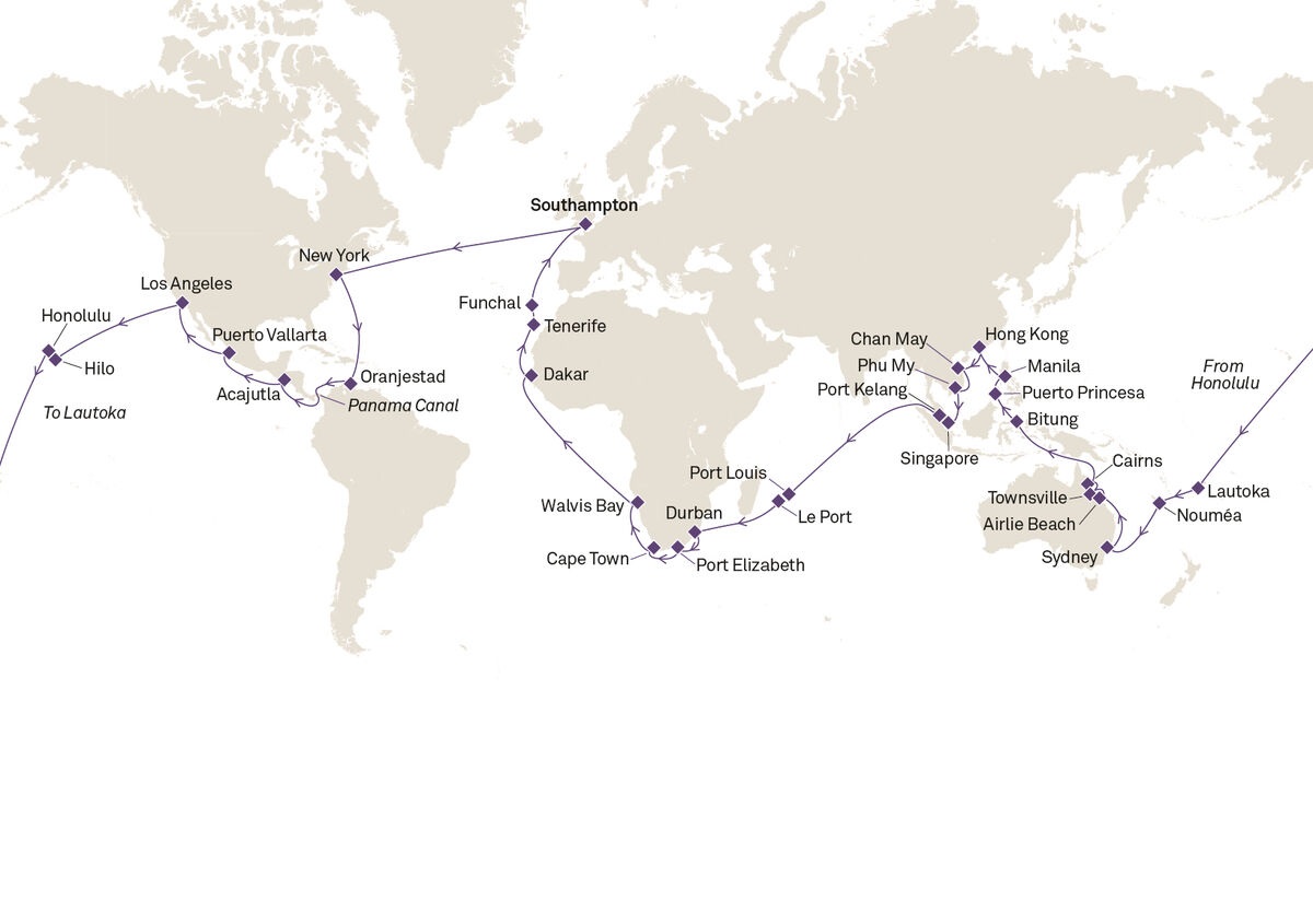 Discover the world during Cunard's 2027 World Cruise on Queen Victoria. Sail 109 nights roundtrip from Southampton, stopping in classic and unique spots in the Panama Canal, South Pacific, Australia, Southeast Asia and Africa. Enjoy seven overnight stays in fascinating ports, like Los Angeles, Sydney, Hong Kong, Singapore, Cape Town, and Funchal on the lovely island of Madeira. Iconic ports, elegant accommodations and impeccable service combine for this Cunard World Voyage to be unforgettable.