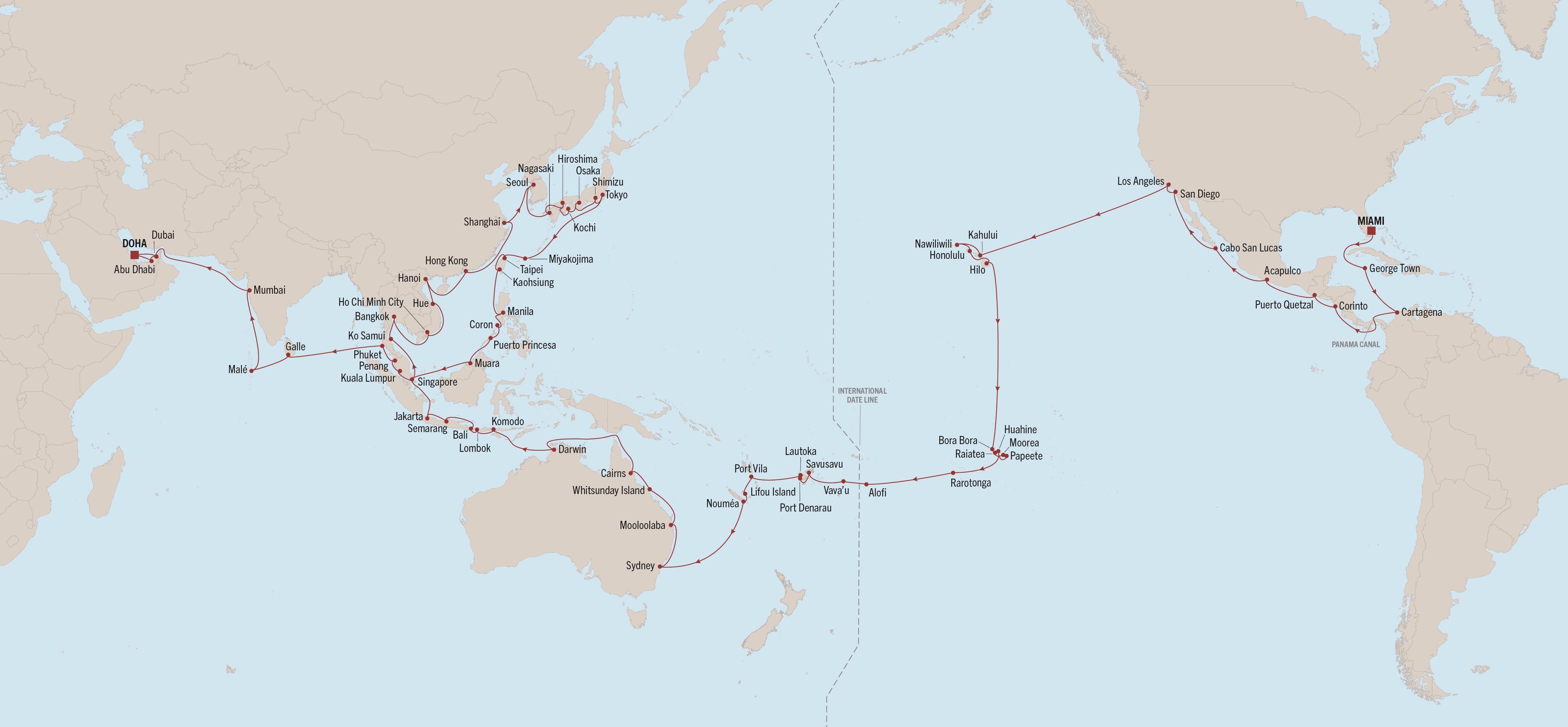 Join us on Oceania Cruises' 2027 Continental Explorer World Cruise on board Oceania Vista. Departing from Miami, this thrilling voyage spans the Pacific islands, Australia, Asia, and the Middle East, where it concludes in dazzling Doha, Qatar. From the Panama Canal to Japan’s cherry blossoms and the modern metropolis of Dubai, experience the world’s cultural, culinary, and natural wonders—all from the comfort of your luxurious home at sea. Additional amenities and exciting programs for full World Cruise guests, including pre-paid gratuities and Shoreside Events create even greater value on this unforgettable journey.