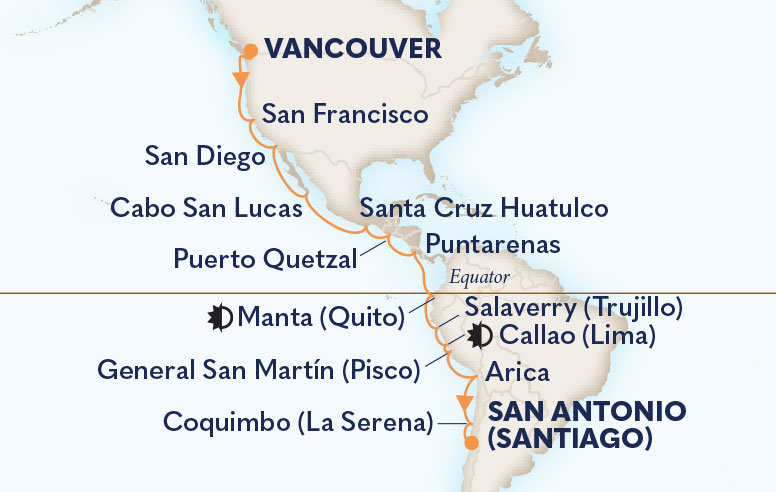Embark on Holland America Line’s unforgettable 26-day Inca Coast: Mexico and Latin America Legendary Voyage aboard Nieuw Amsterdam. Sail from Vancouver to San Antonio (Santiago), discovering vibrant ports, coastal beauty, and rich cultural history along the way. Enjoy rare overnight stays in Manta and Lima, allowing deeper exploration of Ecuador’s and Peru’s fascinating traditions, cuisine, and landscapes. This extraordinary journey blends relaxation, discovery, and immersive experiences for travelers seeking an epic adventure along the Pacific shores.