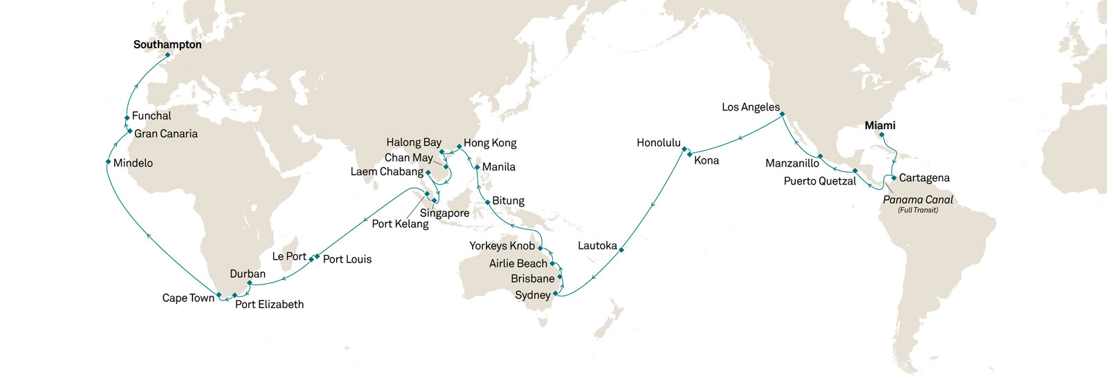 Discover the world during Cunard's 2028 World Cruise on Queen Anne. Sail 99 nights from Miami to Southampton, stopping in classic and unique spots in the South Pacific, Australia, Southeast Asia, and Africa. Enjoy six overnight stays in fascinating cities, such as Los Angeles, Sydney, Hong Kong, Singapore, Gqeberha (Port Elizabeth), and Cape Town, as well transit the Panama Canal. Iconic ports, elegant accommodations and impeccable service combine for this Cunard World Voyage to be unforgettable.